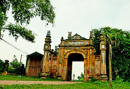 | Men theo con đường lát gạch đỏ là một cầu đá chín nhịp đầu rồng bắc qua sông Nguyệt Đức sang chợ Nôm đã tồn tại trên 200 năm. |